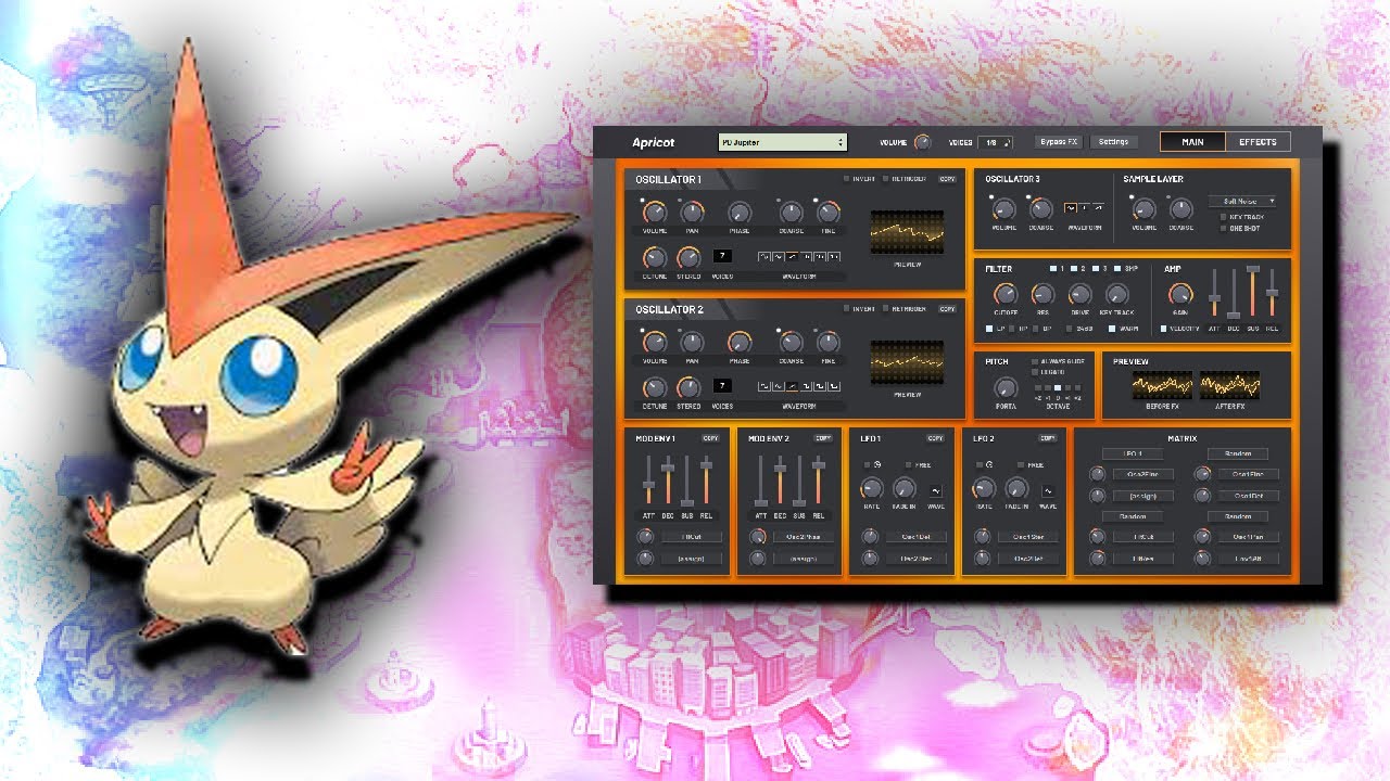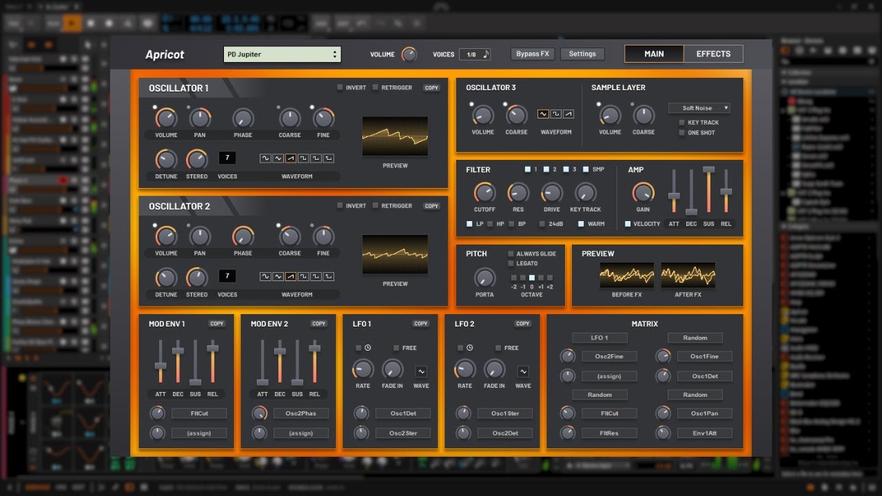 Apricot is a compact hybrid synthesizer designed to deliver a powerful and expansive sound. It features two main oscillators with six subtractive waveforms, modulatable phase offset, and panorama controls, complemented by a unison mode inspired by the supersaw. An additional third oscillator serves as a sub-oscillator with simplified parameters. The synth includes a sample layer with 44 factory samples across various categories and allows users to import their own samples for further customization.