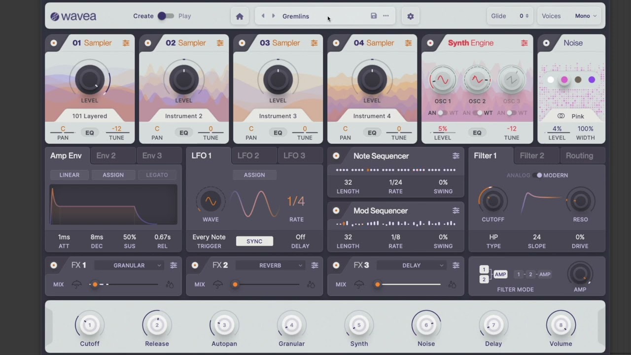 This synth includes dual 32-step sequencers capable of modulating notes, pitch, rate, and gate, providing intricate rhythmic and melodic sequencing possibilities. Its sound-shaping capabilities are enhanced by dual filters with selectable slopes, three LFOs with versatile triggering and timing options, and three assignable envelopes. The extensive modulation matrix allows deep customization, while multi-effects such as granular reverb, chorus, and delay add dimension. Additionally, eight custom macros and five 3-band EQs help refine and sculpt each voice precisely.