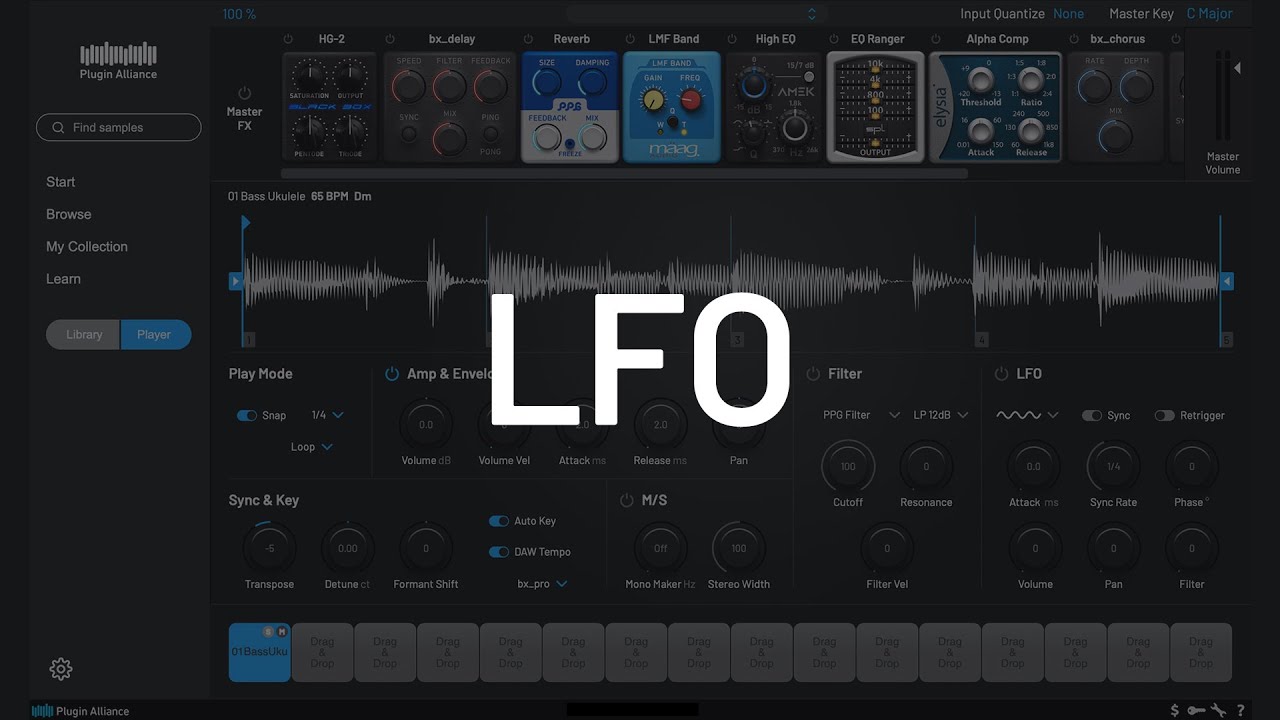 Each sample slot is equipped with individual processing capabilities, featuring a collection of high-quality modeled filters like the Knifonium for rich tube warmth, bx_oberhausen for lush tonal character, and the PPG filter, alongside a diverse selection of branded effects pedals from renowned partners including Black Box Analog Design, AMEK, and elysia. The plugin supports multiple playback modes such as loop, ping-pong, reverse, and reverse loop, with precise waveform editing tools that let you zoom and adjust start and end points on the beat grid to tailor the sample playback.