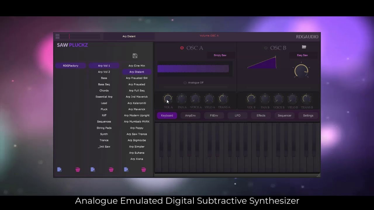 The synthesizer includes a robust arpeggiator and sequencer, enabling the creation of complex, evolving patterns that add depth and movement to compositions. High-quality effects such as delay, reverb, EQ, digital and analogue filters, and compression offer extensive sound-shaping possibilities. SAWPluckz's unique combination of 13 analogue and 14 digital oscillators provides diverse tonal options, empowering users to craft distinctive soundscapes and textures.