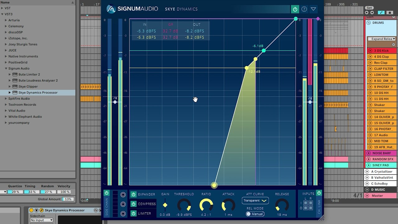 SKYE Dynamics is a comprehensive multi-stage dynamics processor combining an Expander, Compressor, and Limiter into a single plugin designed for music production. It emphasizes ultra-transparent processing with algorithms engineered to minimize distortion and saturation. This makes it an excellent choice for both mixing and mastering, where maintaining the integrity of the original audio is crucial. The plugin offers advanced adaptive auto release and a variety of envelope presets, enabling precise control over dynamic shaping.