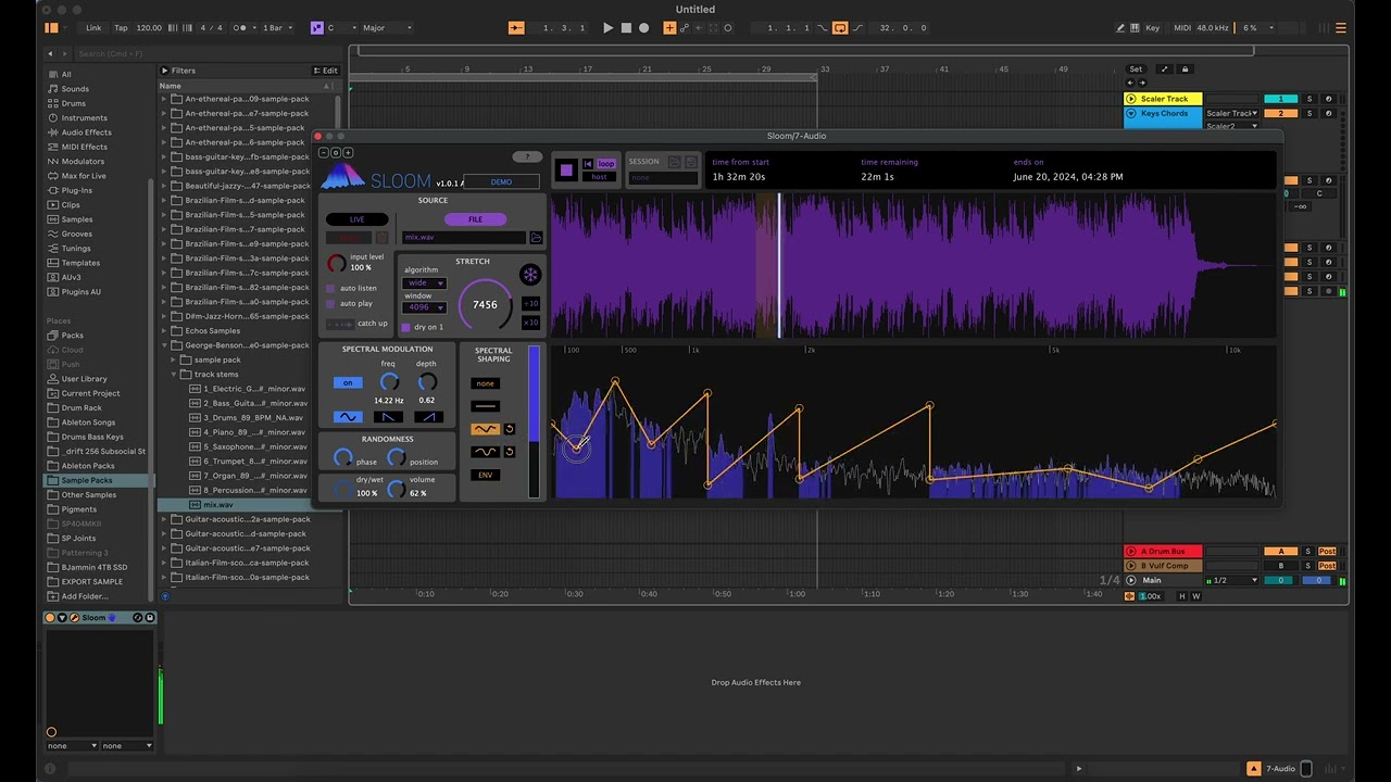 Sloom is a powerful timestretching tool designed to transform any audio into immersive, expansive soundscapes. By significantly slowing down playback, it reshapes sounds into smooth, fluid textures that evolve over time. This process allows producers to craft deep ambient atmospheres and intricate sonic layers from even simple audio sources.