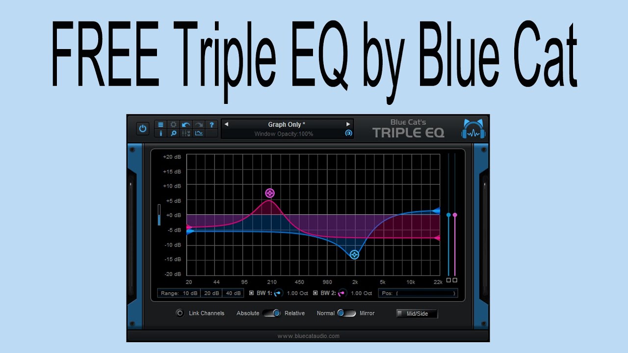 Blue Cat's Triple EQ is a straightforward 3-band semi-parametric equalizer designed for precise sound shaping. It features a low shelf filter, a high shelf filter, and a boost/cut peak filter, each offering a wide gain range of ±40 dB and adjustable bandwidth from 0.01 to 5 octaves. These filters are interconnected, allowing you to modify the center frequency or bandwidth with one control, simplifying the equalization process and making it highly intuitive.